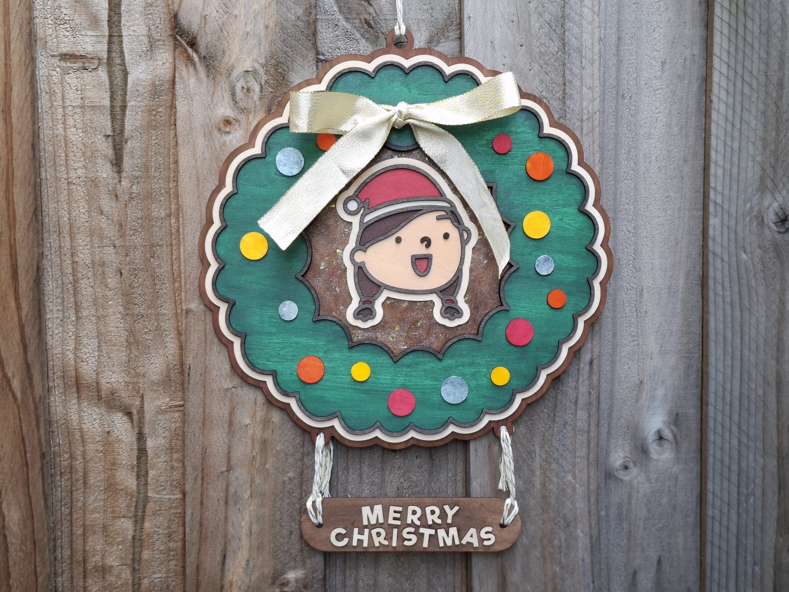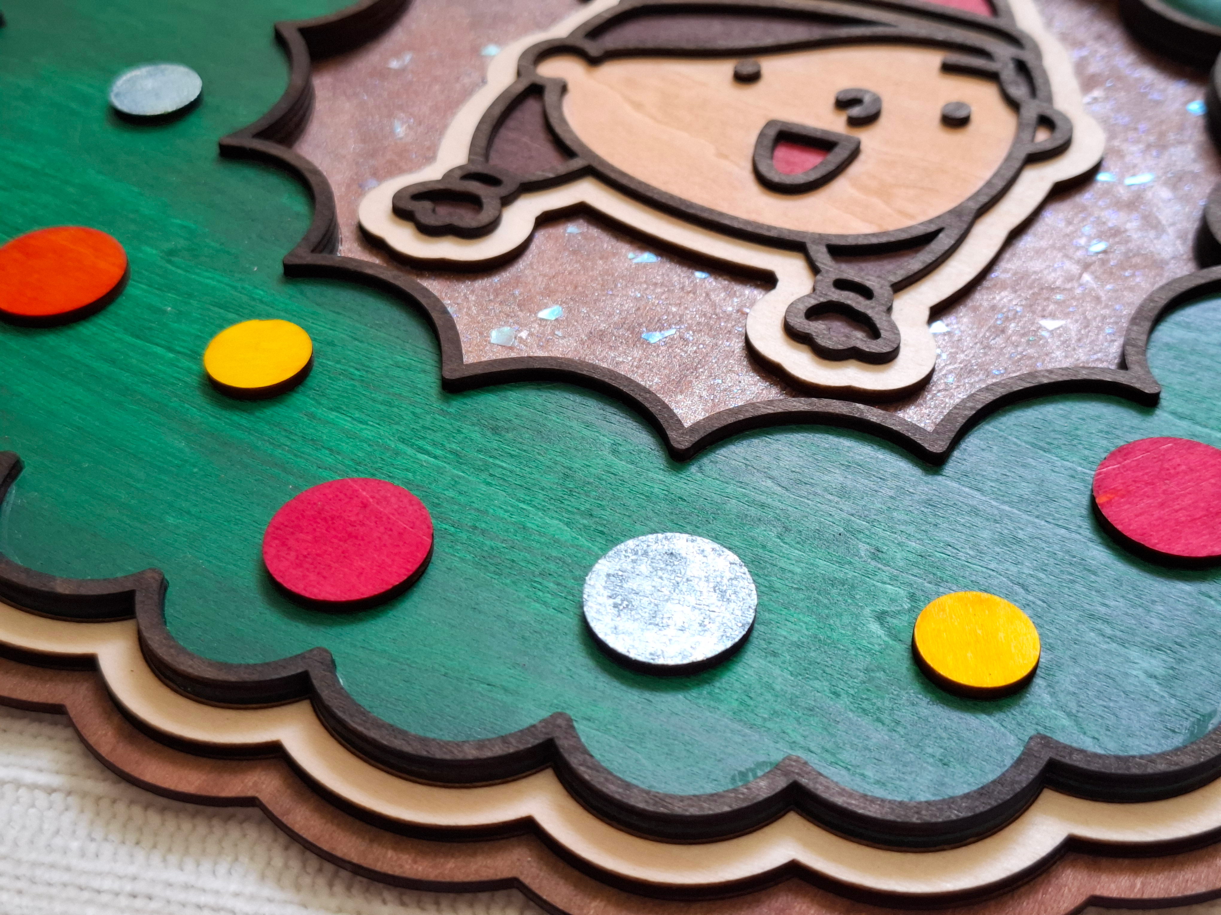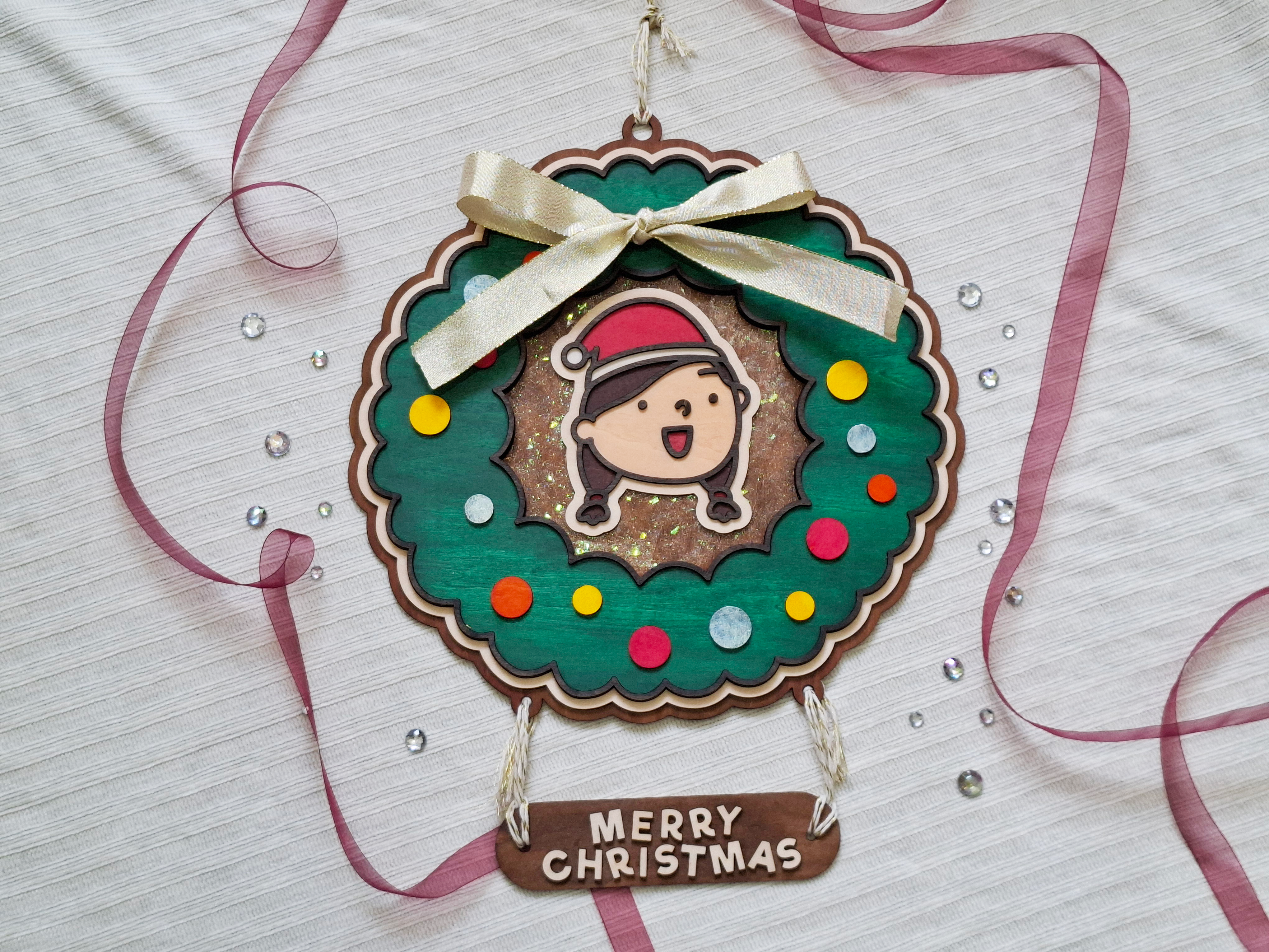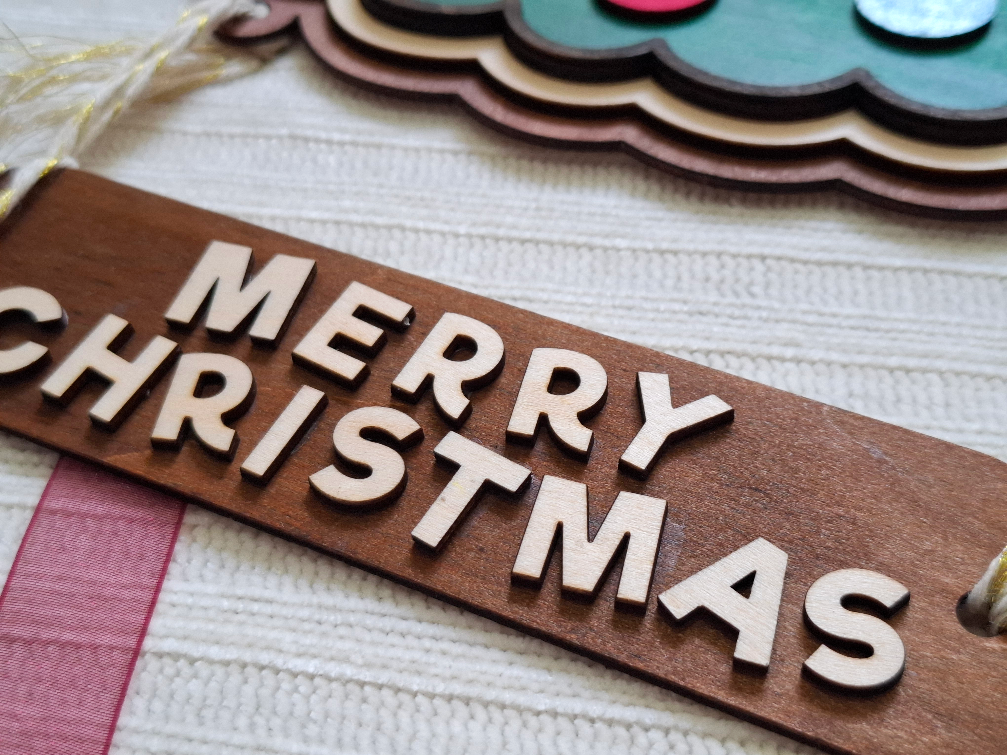 以溫暖手感迎接佳節!這款手繪木製聖誕門牌採用多層木板雕刻,呈現立體層次感,搭配彩色花圈與緞帶裝飾,充滿節日氣氛。